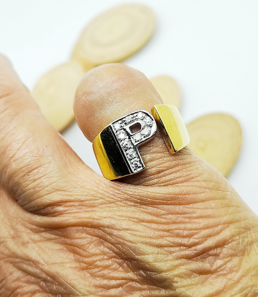 Anello in oro giallo 18kt con iniziale in oro bianco e brillanti larghezza fascia 12 mm.