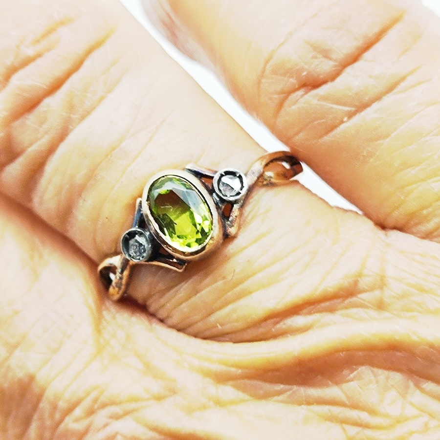 Anello in oro 12 kt con peridoto e 2 diamanti taglio rose d'Olanda.