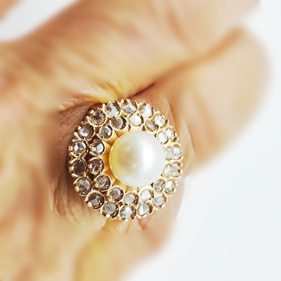 Anello Toppa con perla, in oro 12 kt, diamanti 0.50 kt taglio rose d'Olanda, perla naturale giapponese 7mm. Gioiello realizzato dai nostri artigiani negli anni 80 su modello originale dell'800 napoletano con materiali tipici dell'epoca.