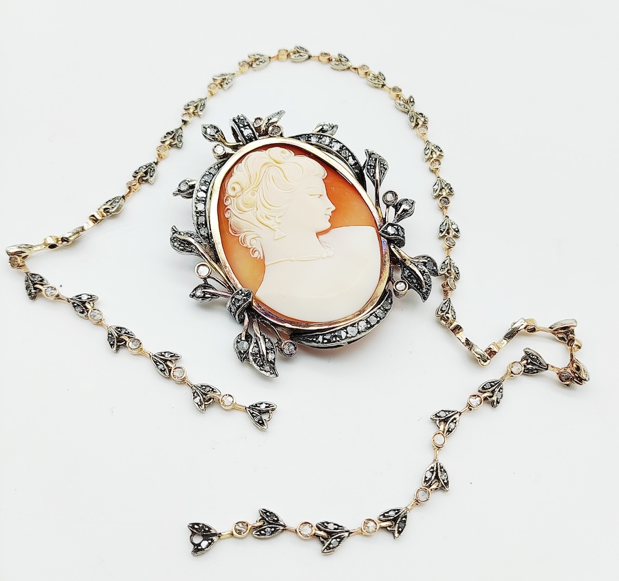Ciondolo con fiore in centro, cameo originale antico, realizzato a fine 800, con lavorazione in oro 14 kt, argento e diamanti taglio rose d'Olanda.
