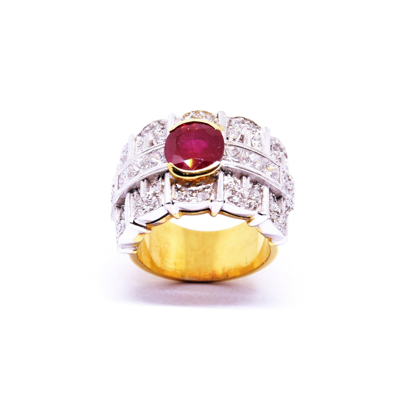 Anello unico nel suo genere: fascia in oro bianco con 6 diamanti taglio Princess 1.02 kt, 44 diamanti taglio brillante 2.50 kt, rubino Birmano color sangue di piccione 2.04 kt, 15 gr oro bianco e giallo 18 kt.