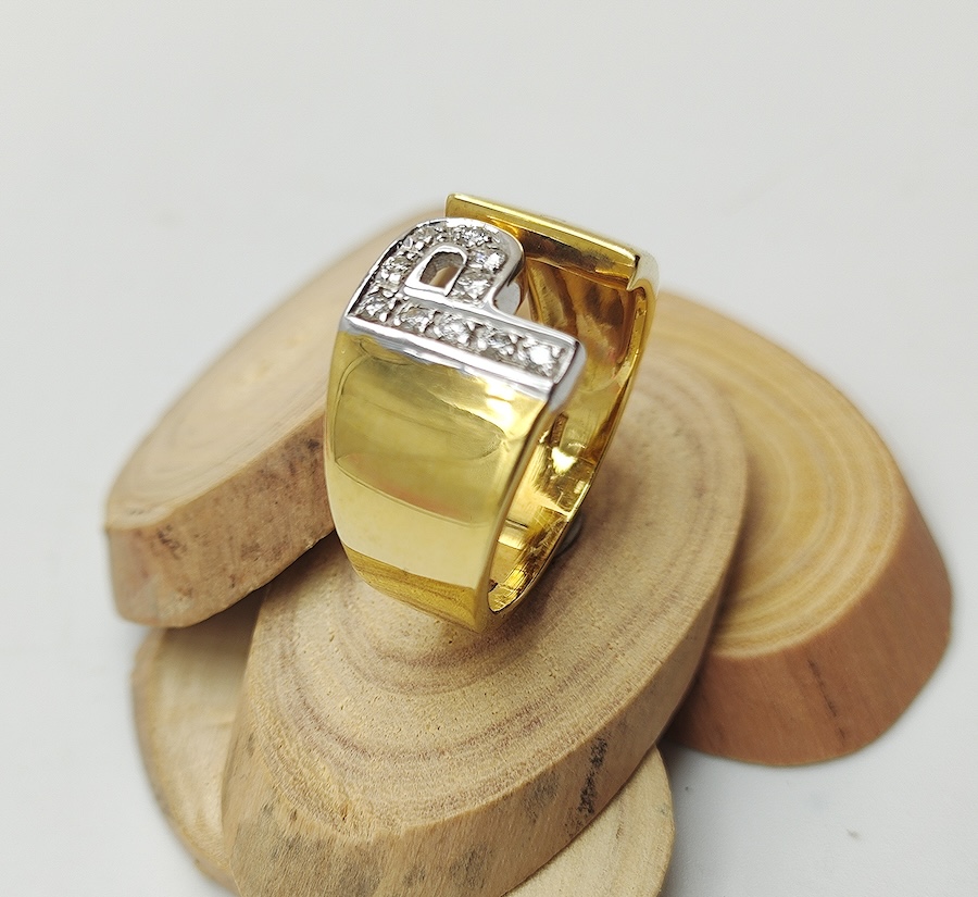 Anello in oro giallo 18kt con iniziale in oro bianco e brillanti larghezza fascia 12 mm.