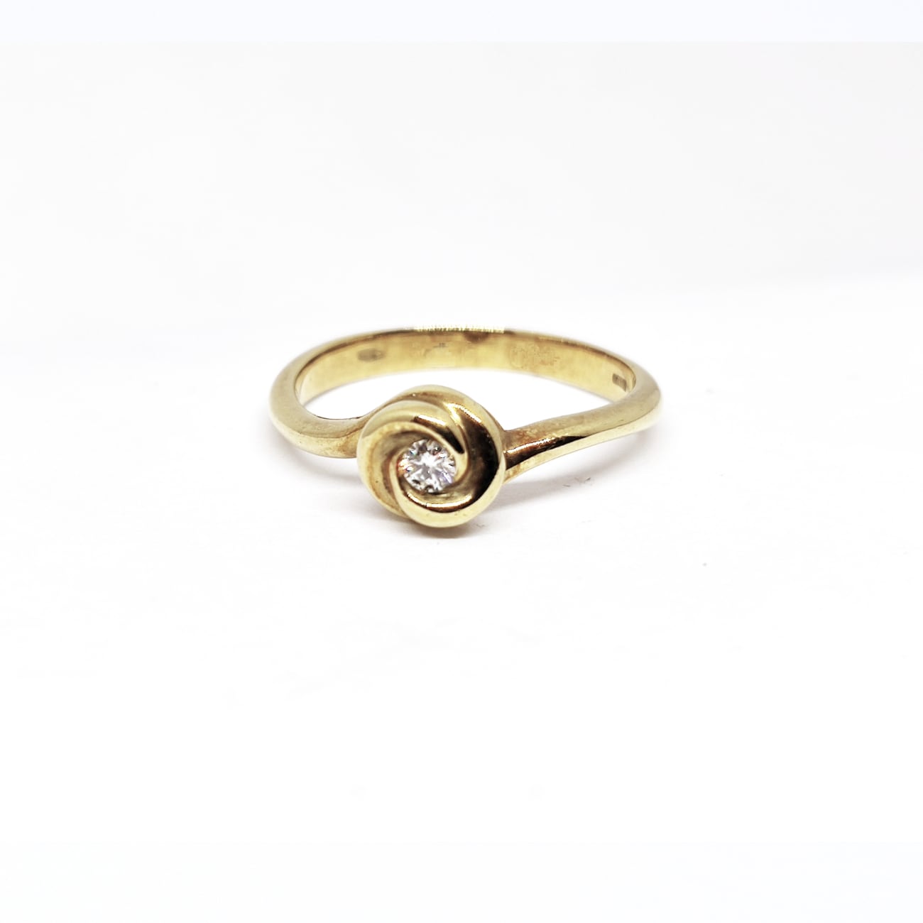 Anello solitario in oro giallo 18 k 3.0 gr con diamante taglio brillante G color IF purissimo 0.04 kt fatto tutto a mano. Disponibile anche in oro bianco.