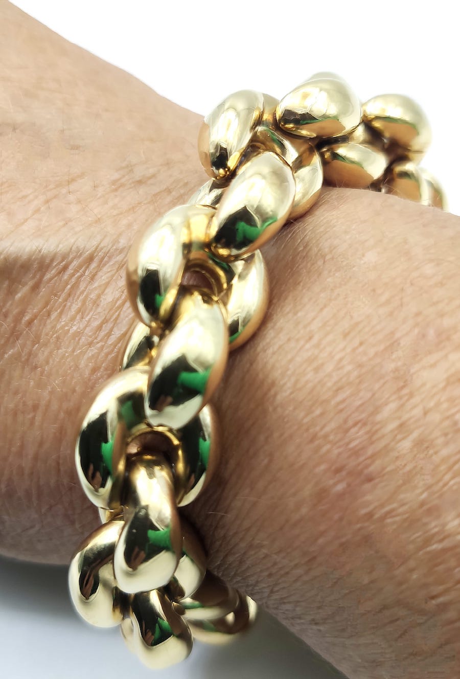 Bracciale in oro bianco e giallo 18 kt con rubino caboucion su chiusura. Lavorazione anni '90. Peso 60gr oro