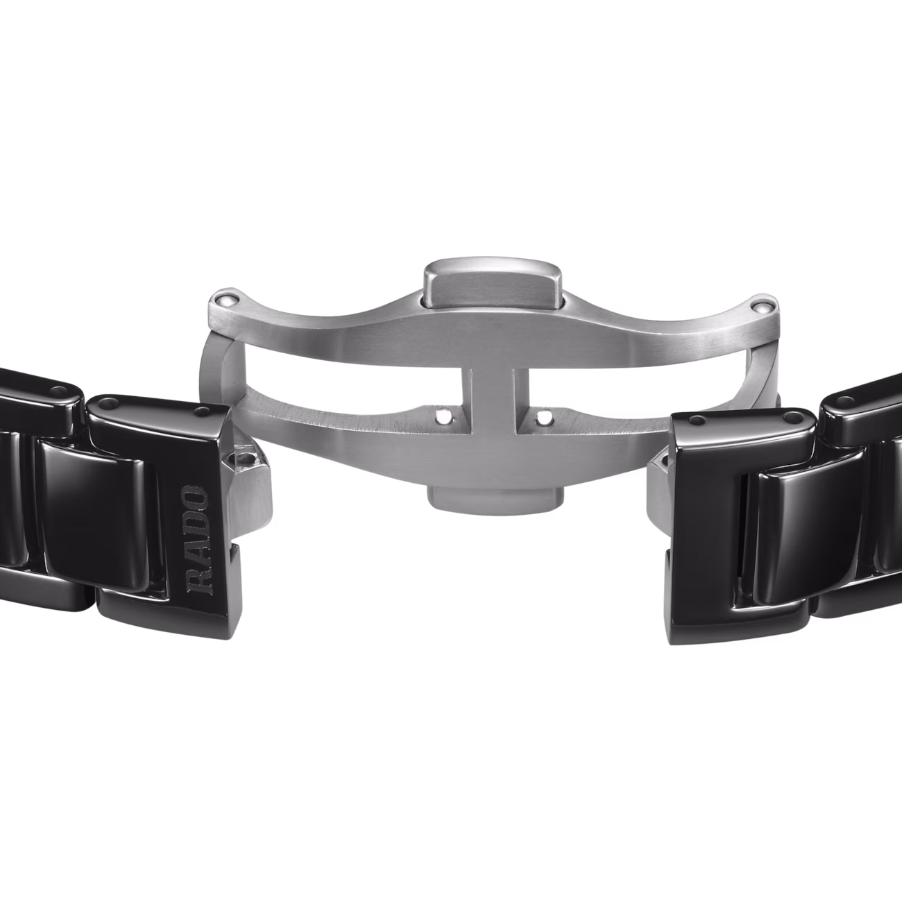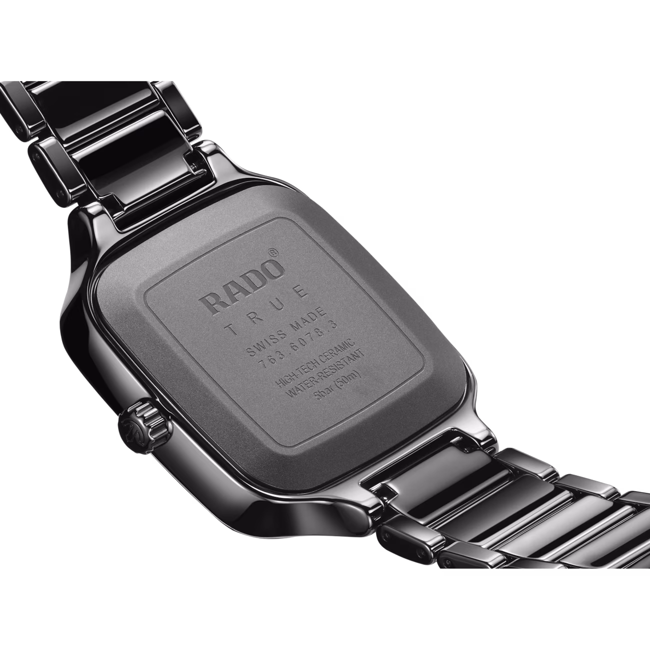 Il True Square ha un diametro di 29 mm ed è composto da una cassa e una corona in ceramica hi-tech nera lucida e da un cristallo zaffiro piatto. Grazie al movimento al quarzo Rado R079, l'orologio scandisce il tempo con precisione e affidabilità. Le sfere e gli indici color oro rosa con Super-LumiNova® bianca si abbinano perfettamente al quadrante che vanta un motivo stampato a raggiera di colore nero. L'orologio è impermeabile fino a 5 atmosfere. Il piacevole comfort del True Square è assicurato da un bracciale in ceramica hi-tech nera lucida con fibbia in titanio a tripla piega.